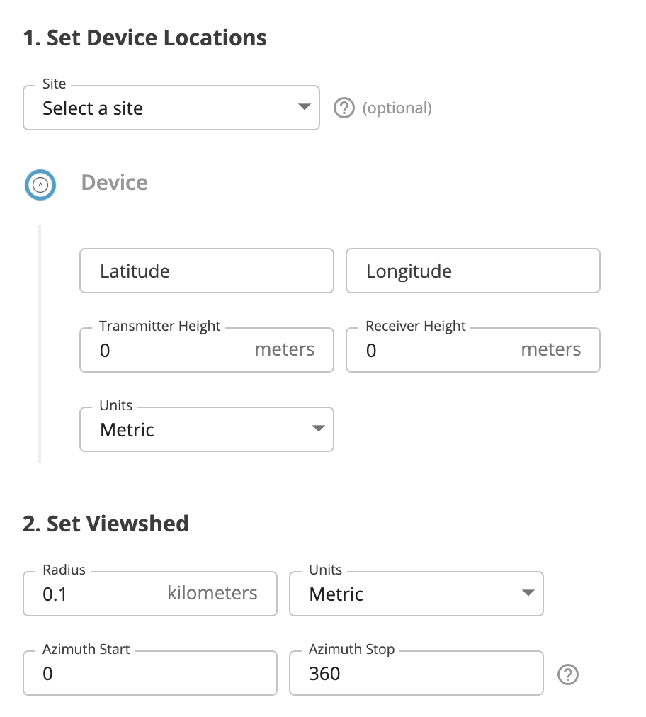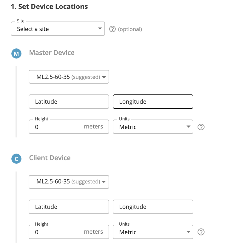 Selecting a site allows you to choose devices already placed on a map from that site, as well as auto-populate radio parameters for the master and client devices.