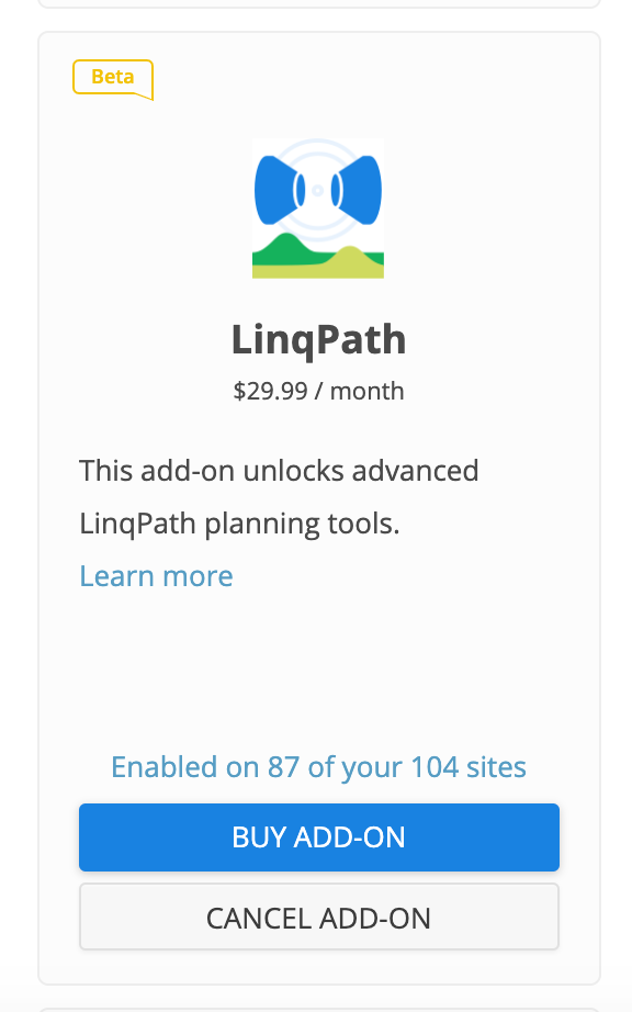 Simply navigate to your site or cloud-level add-ons page from the main navigation menu on the left, and click the "Buy add-on" button under the LinqPath Pro add-on.