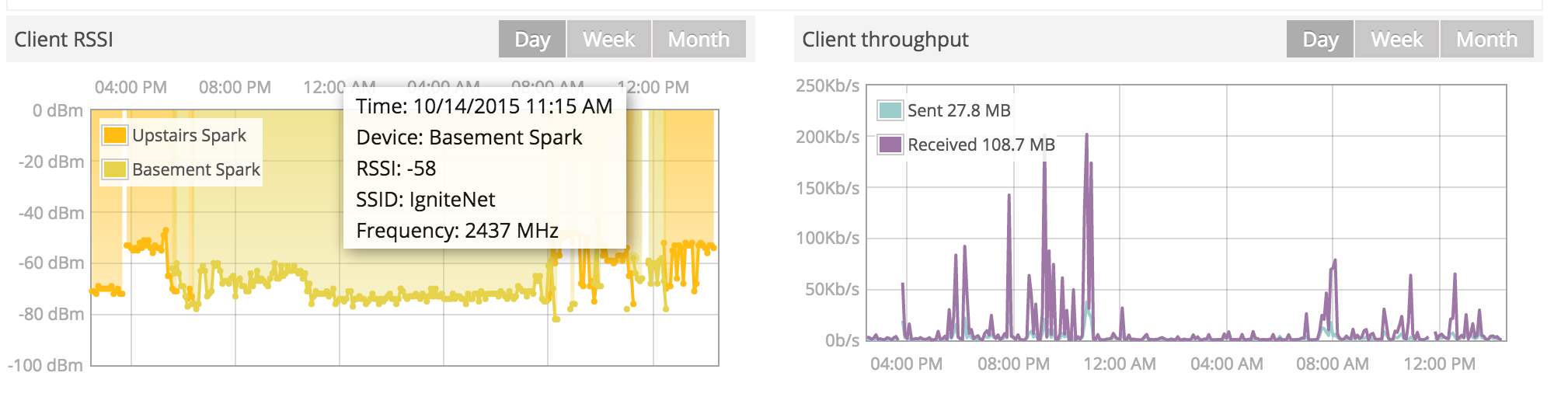 Here's a screenshot of the latest client graphs that have been added on the wireless client detail page: