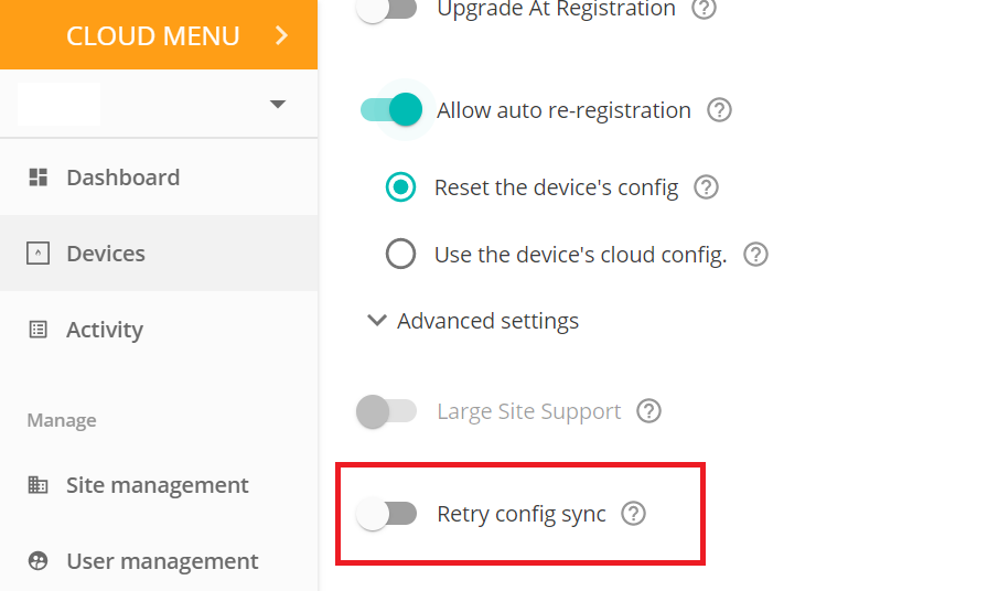 There is a new feature called "Retry Config Sync" under site properties,once this is enabled, cloud will try to re-sync when there is a config sync error.