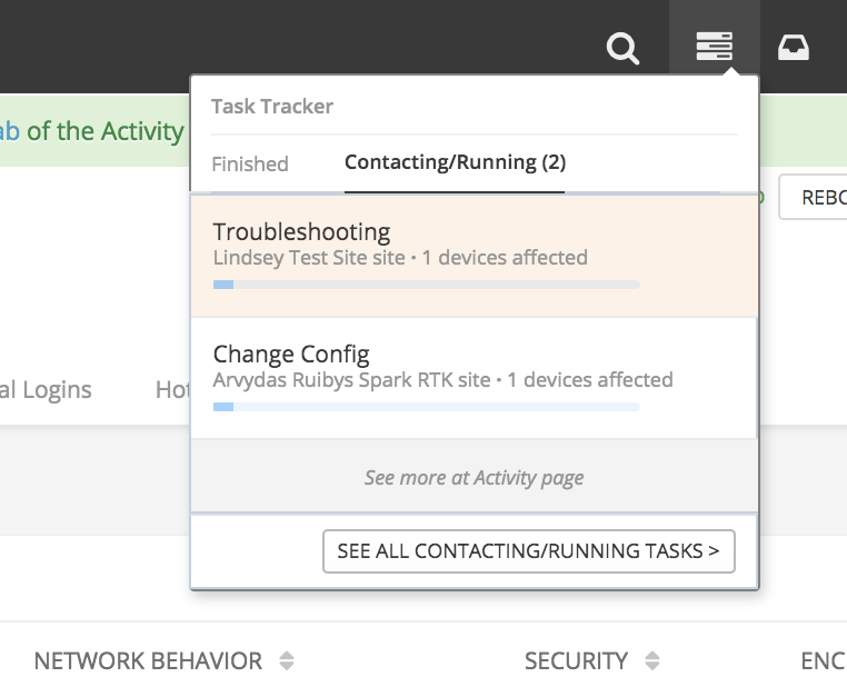 Live actions (those that require a "live" connection with the device, such as troubleshooting file fetch, reboot, or packet capture) have been combined with main device menu options, and is available on all pages from the device-level context.